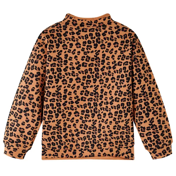 Ta bluza dziecięca ma długie rękawy, wzór w panterkę, falisty golf i luźny krój. Wykończono ją falistym, lekko zrolowanym brzegiem. Bluzka dziecięca została wykonana z miękkiego materiału zawierającego 95% bawełny i 5% elastanu, dzięki czemu zapewnia większą wygodę i ciepło.