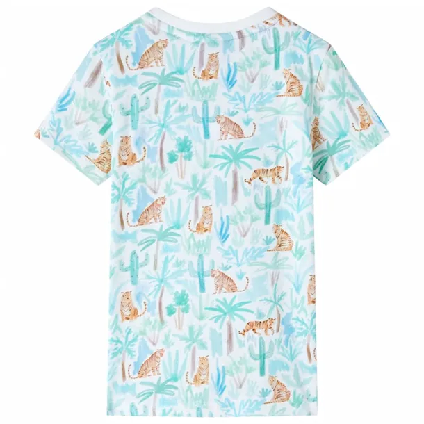 Ta dziecięca koszulka ma krótkie rękawy, okrągły dekolt i prosty krój. Została ozdobiona nadrukiem tygrysów na całej powierzchni. Dziecięcą koszulkę z krótkimi rękawami wykonano w 95% z bawełny i w 5% z elastanu, dzięki czemu jest miękka i przyjemna w dotyku.