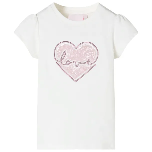 Ta dziecięca koszulka ma krótkie rękawy, okrągły dekolt i prosty krój. T-shirt w kolorze ecru ozdobiono uroczym sercem z cekinów. Wykonano go w 95% z bawełny i w 5% z elastanu, dzięki czemu jest miękki i przyjemny w dotyku.